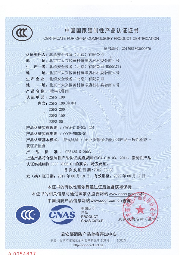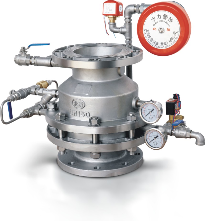 ZSFS-(50-300)-2.5活塞式雨淋閥組由雨淋閥、水力警鈴、防復(fù)位閥、電磁閥和控制腔供水管路、雨淋報(bào)警閥開啟管路、報(bào)警管路、排水管路、壓力表等部件組成?;钊接炅荛y中有控制腔、供水腔和管網(wǎng)腔。依靠活塞帶動(dòng)密封封住供水口??刂魄坏募訅汉托箟焊淖兓钊恢?,決定雨淋閥的開啟或關(guān)閉。電磁閥動(dòng)作或打開緊急手動(dòng)球閥都可以起動(dòng)雨淋報(bào)警閥。防復(fù)位閥的作用是當(dāng)控制腔泄壓雨淋報(bào)警閥開啟后,封住控制腔進(jìn)水通道,防止因控制腔增壓雨淋報(bào)警閥復(fù)位斷水,在雨淋報(bào)警閥關(guān)閉時(shí),打開控制腔進(jìn)水通道補(bǔ)壓,防止雨淋報(bào)警閥開啟造成誤噴事故。